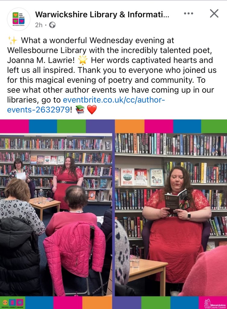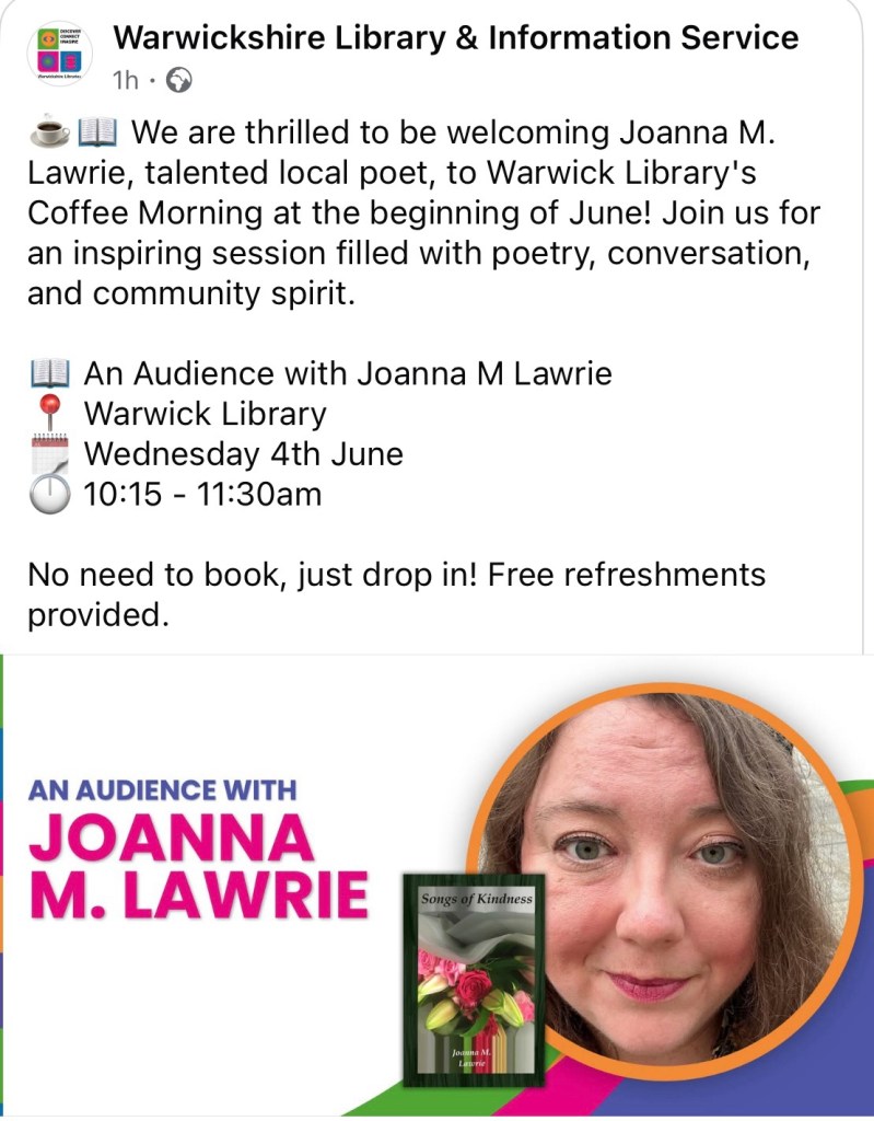 Joanna was invited to hold an event at Wellesbourne Village Library, Warwickshire, on Wednesday 19th February. She was interviewed by a wonderful lady from Warwickshire libraries named Laura, and performed several poems, both from Songs of Kindness and some new material never before seen!